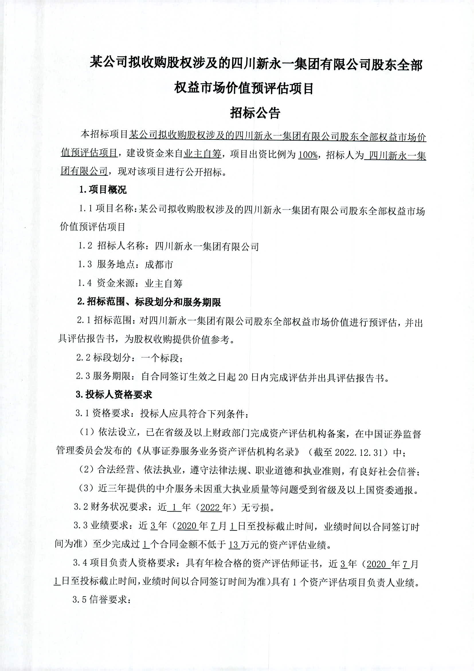 某公司拟收购股权涉及的四川新永-集团有限公司股东全部权益市场价值预评估项目招标通告